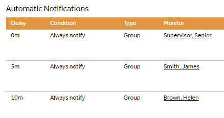 For example, in the previous image, if a user triggers a Panic Emergency, the Senior Supervisor, James Smith, and Helen Brown are all immediately notified by SafetyLine.
