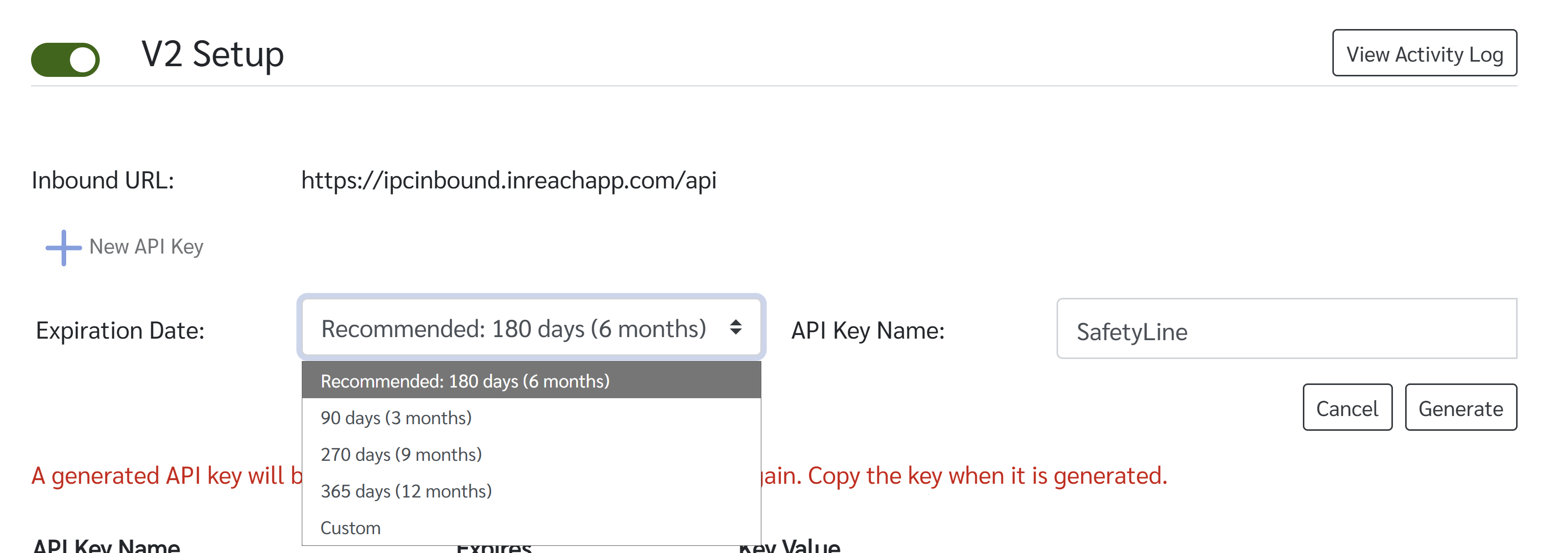 Scroll down to the "V2 Setup" section and make it is toggled on. Then, select "New API Key," and set the Expiration Date dropdown to the period of time that works best for you and your organization's policy on key expiration. In the API Key Name space, enter