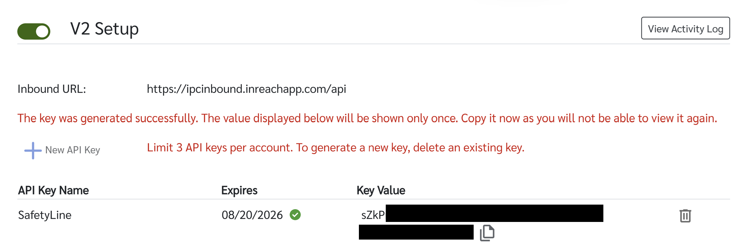 - Only one API Key can be generated per Company ID. To function, all SafetyLine users within the Company need their inReach profiles on the same https://explore.garmin.com user account under which the API Key is generated.