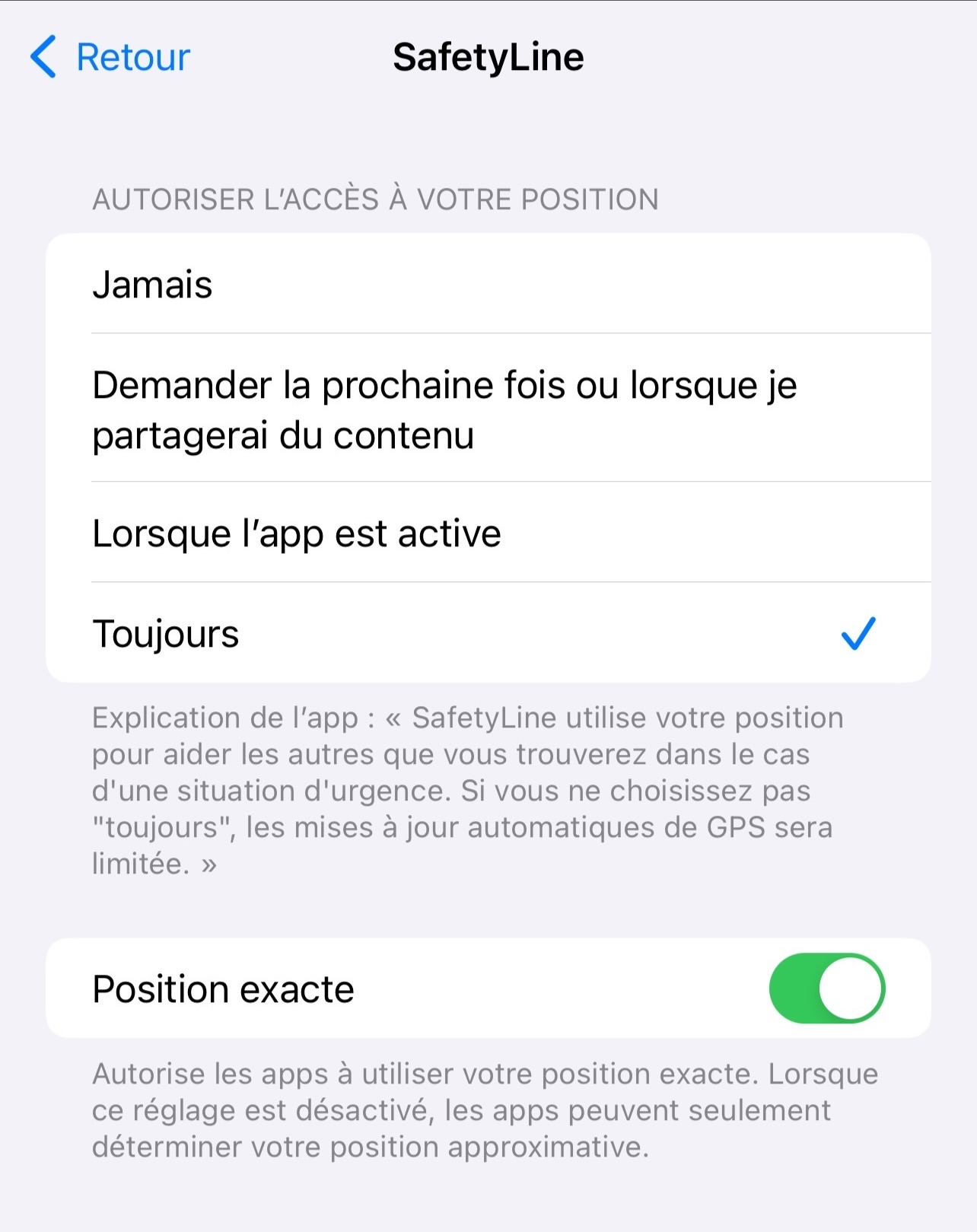 Dans l'application « Réglages » de votre iPhone, faites défiler jusqu'au bas de la page et sélectionnez l'application SafetyLine. Sélectionnez « Emplacement » et mettez-le sur « Toujours », le GPS est maintenant activé pour SafetyLine. En outre, activez la fonction « Position exacte ».