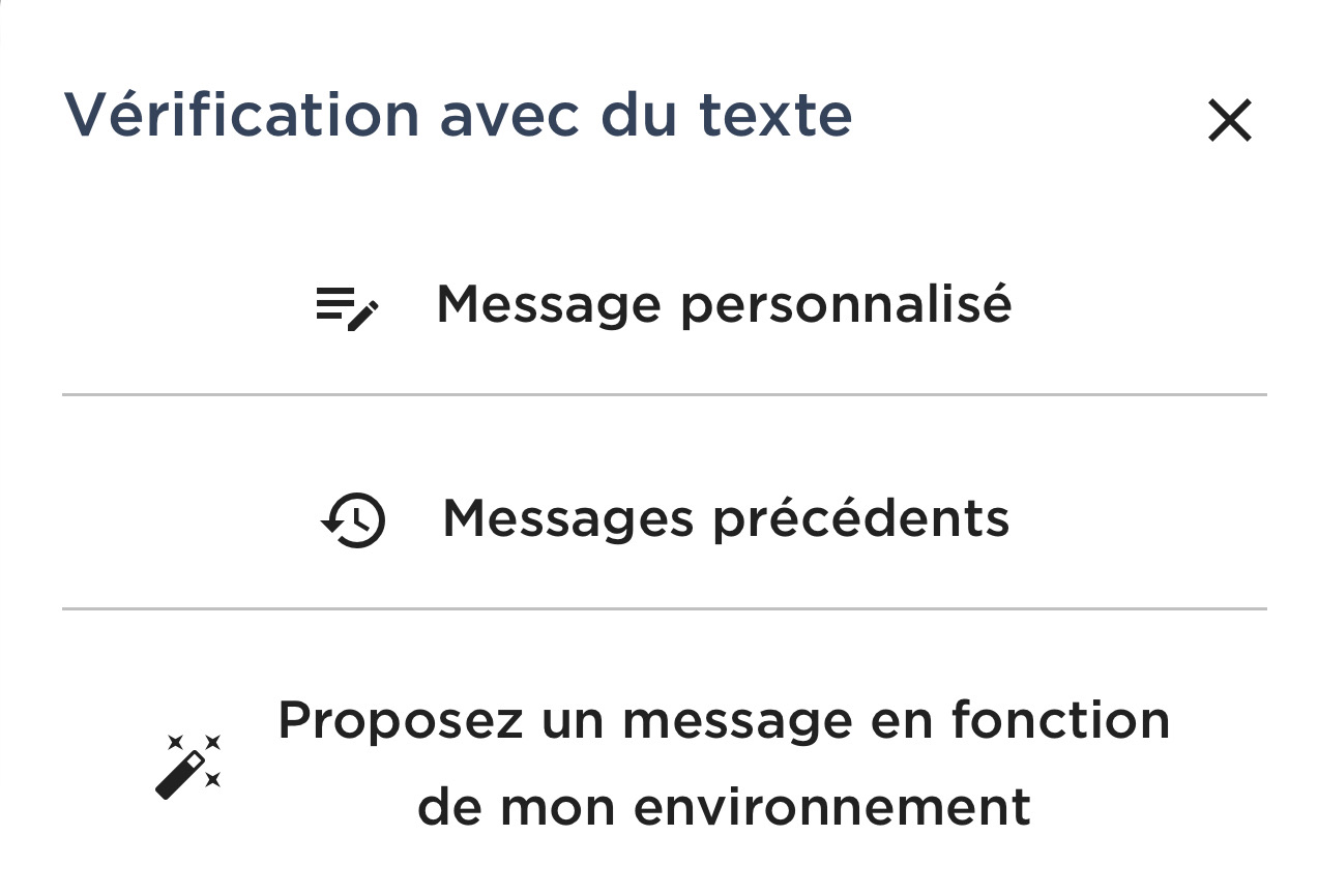 Si vous choisissez de laisser un message texte, plusieurs options s'offrent à vous : un message texte personnalisé que vous pouvez saisir dans une zone de texte libre, un message texte que vous avez déjà utilisé par le passé ou un message suggéré en fonction de votre environnement, qui créera une légende générée par l'IA sur la base d'une photo fournie de votre environnement.