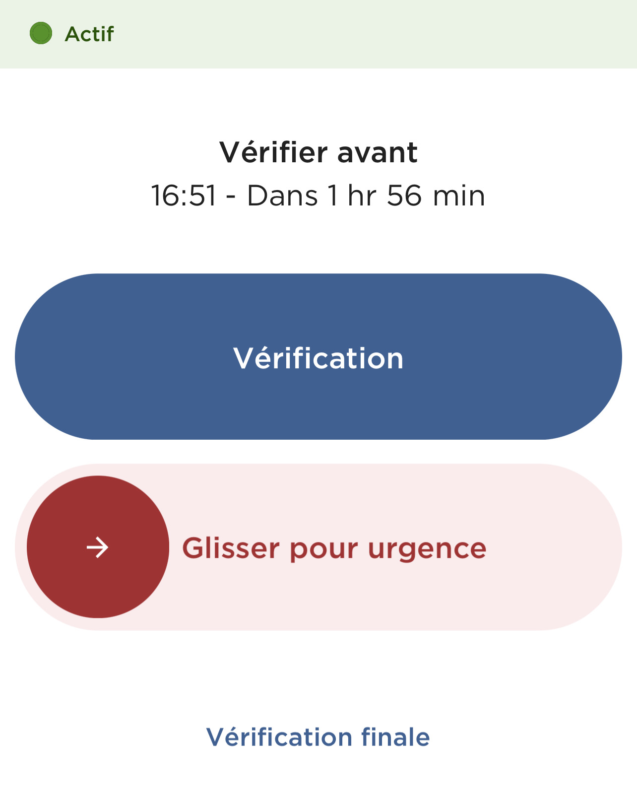 Un bouton « vérification finale » apparaît également en bas de l'écran. Utilisez le bouton « vérification finale » pour mettre fin à votre surveillance SafetyLine.