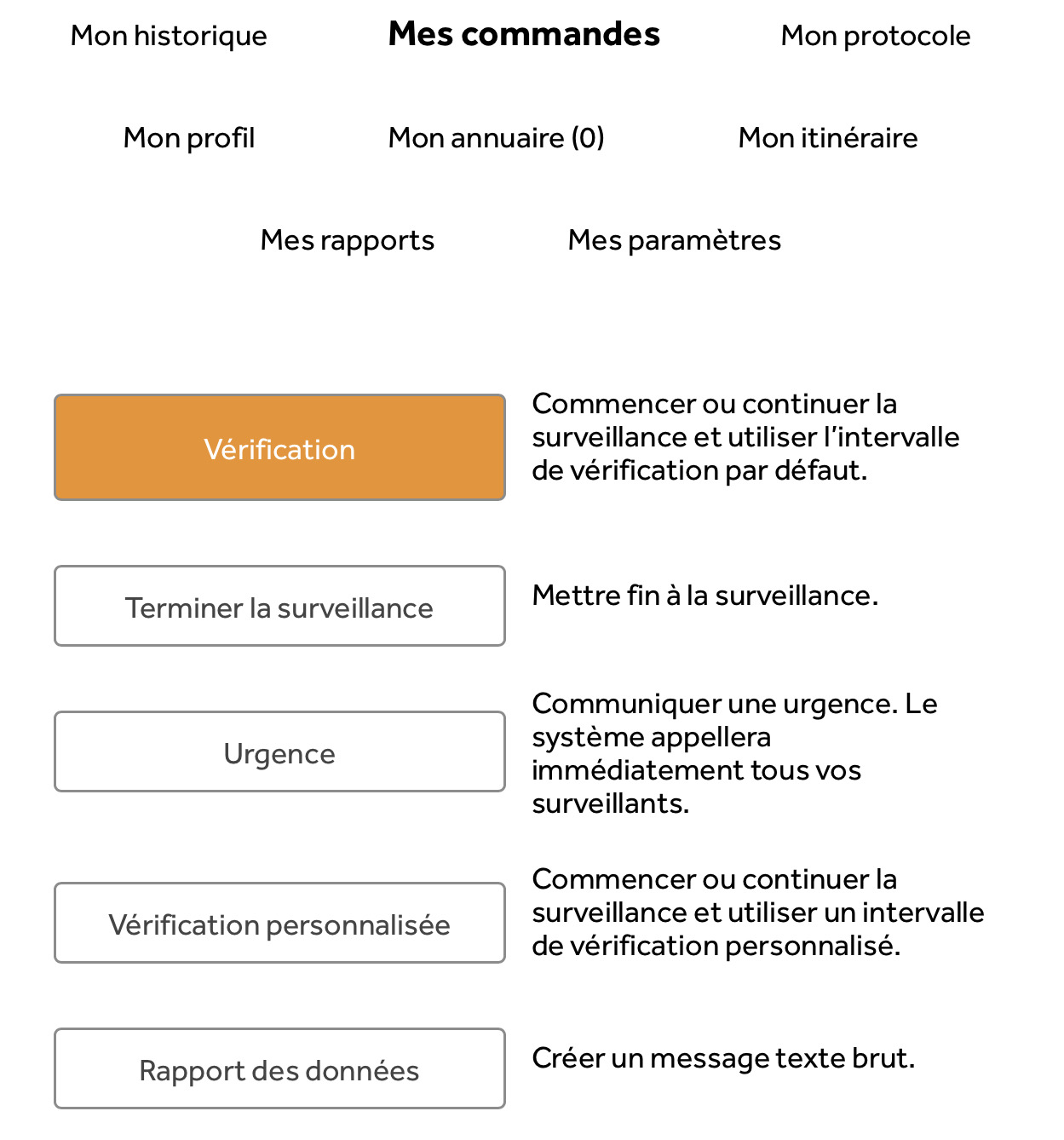 L'option « Vérifier » permet à l'utilisateur de s'enregistrer dans le système SafetyLine et de commencer sa surveillance.