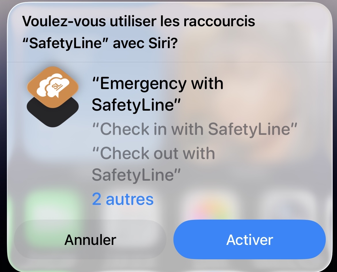 - Dites à voix haute : « Dis Siri, active les raccourcis SafetyLine ».